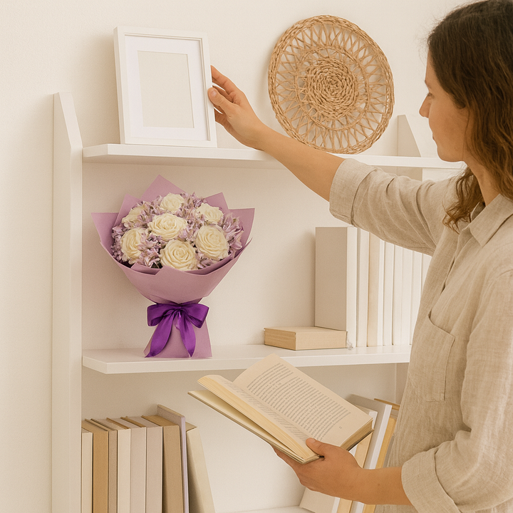 This bouquet is meant for someone who brightens your days, whether you’re honoring a special moment, marking a happy occasion, or cherishing a close bond. Soft white roses pair beautifully with purple alstroemeria, creating a gentle blend of color and texture. Choose this arrangement for its timeless elegance and its ability to express affection, appreciation, and celebration in one graceful gift.
