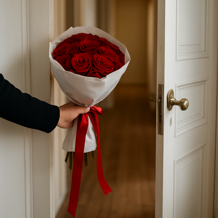 This bouquet is made for anyone you wish to make feel deeply cherished. Featuring lush red roses wrapped in crisp white paper with flowing red ribbons, it offers a bold expression of admiration and warmth. Choose this design for its rich color, full blooms, and timeless elegance that instantly stands out among classic rose arrangements.
